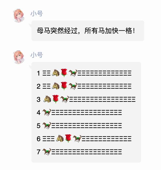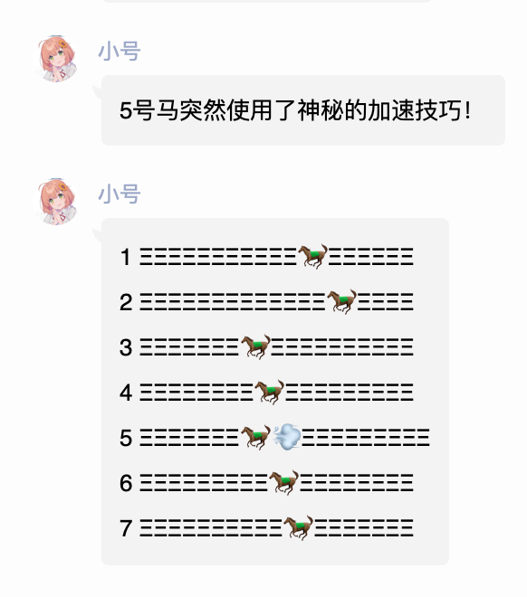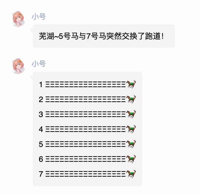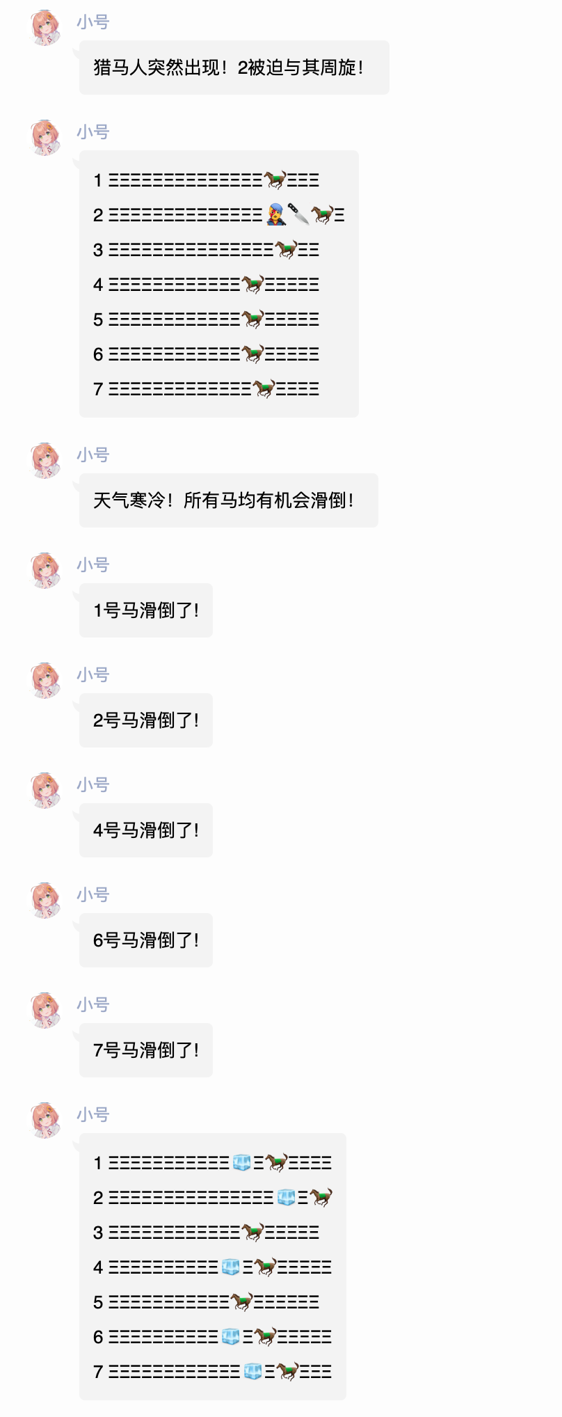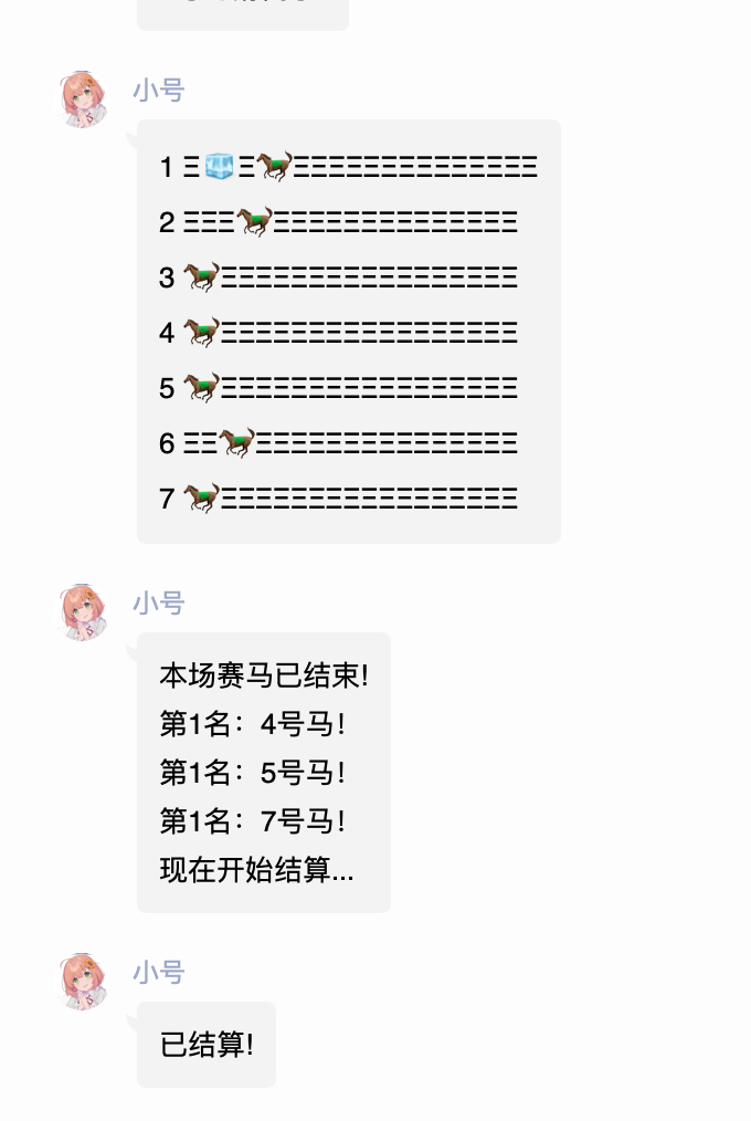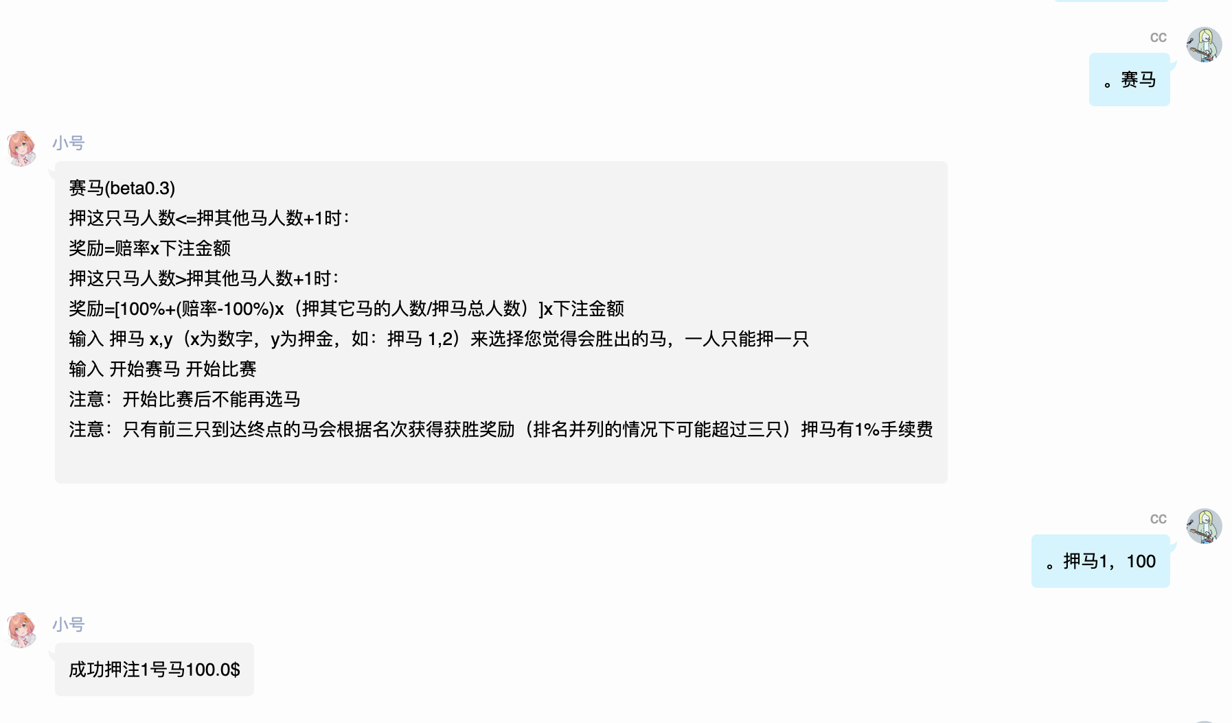 赛马(beta0.3) 押这只马人数<=押其他马人数+1时: 奖励=赔率x下注金额 押这只马人数>押其他马人数+1时: 奖励=[100%+(赔率-100%)x(押其它马的人数/押马总人数)]x下注金额 输入 押马 x,y(x为数字,y为押金,如:押马 1,2)来选择您觉得会胜出的马,一人只能押一只 输入 开始赛马 开始比赛 注意:开始比赛后不能再选马 注意:只有前三只到达终点的马会根据名次获得获胜奖励(排名并列的情况下可能超过三只)押马有1%手续费